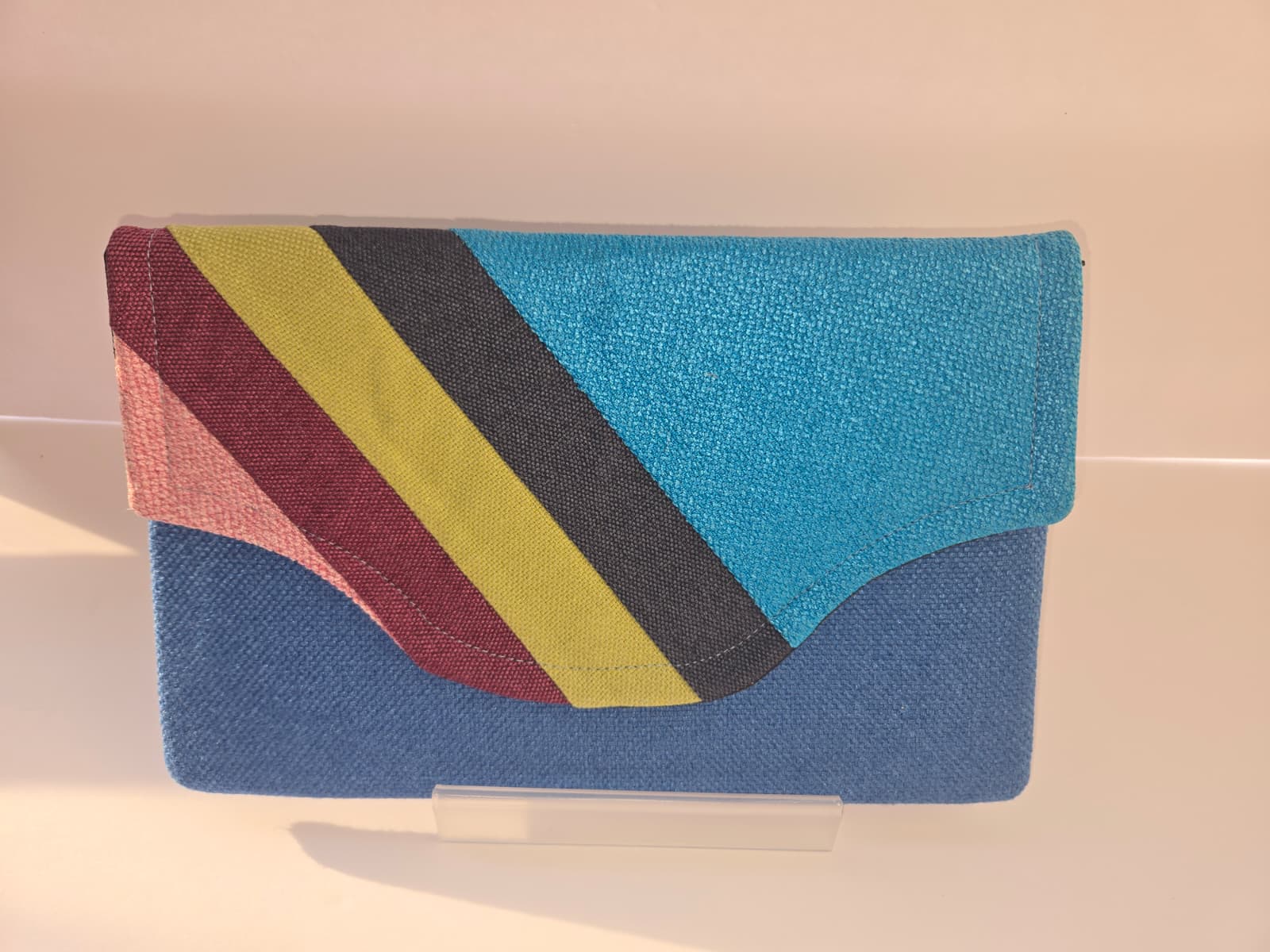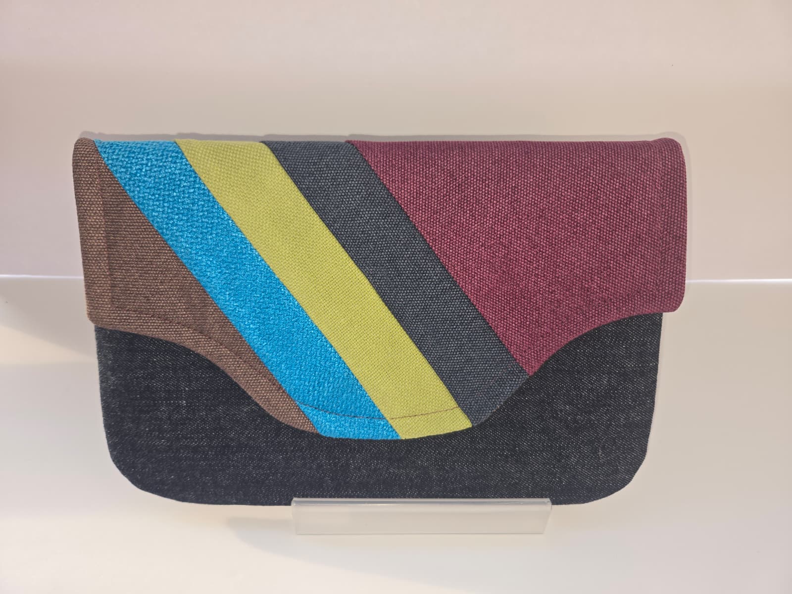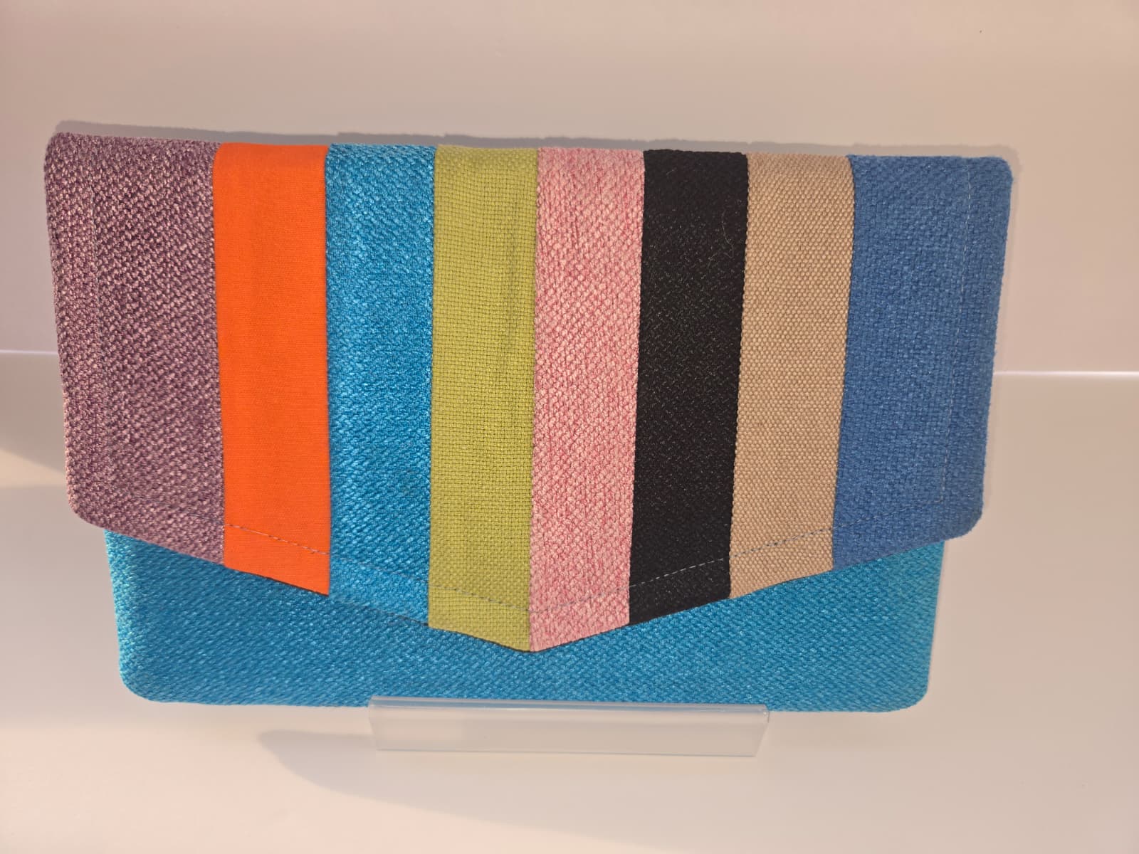 A stylish fabric clutch bag designed with bold vertical color panels, perfect for adding a pop of vibrance to any outfit. Compact yet chic, it’s ideal for both casual outings and special occasions.